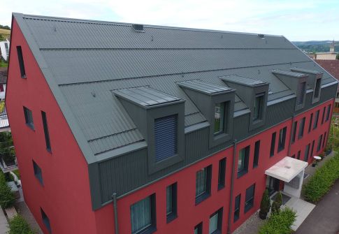 | Objekt DEFH Wiesendangen | Kunde / Verleger Egloff + König GmbH, Frauenfeld | Material Zink vorbew. Blaugrau 0.70 mm | Menge 180 m2 | Bemerkung Neubau Dach m. Lukarne |